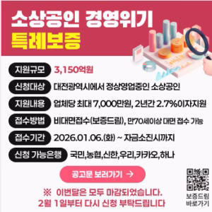 2026년 대전시 소상공인 특례보증 사업 내용(경영위기극복 7천만·이자 2.7%), 유성구 중구 차이, 신청 서류·절차·협약은행·금리·대전신용보증재단 문의 총정리.